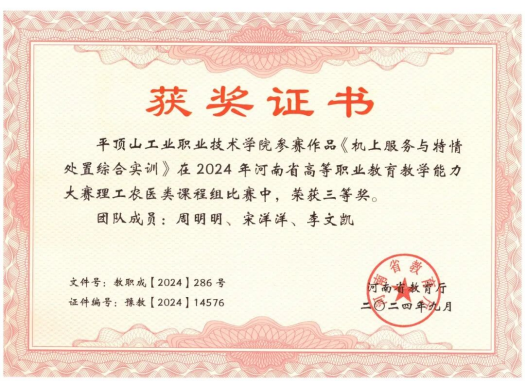 航空学院目前有空中乘务实训中心、机场运行实训中心和实体教学实训飞机,实训设备包括庞巴迪CR-200真机、机场环境模拟系统、空客A330飞机双通道模拟舱、CRH380B动车模拟器等。通过实景化实践教学,结合岗位技能需求,不断提升学生职业能力。航空学院教师多次在河南省教师教学能力比赛中获奖;航空学院学生多次在“空中丝路杯”全国航空职业院校空中乘务技能大赛中获奖;在2023年河南省首届职业生涯规划大赛中获得铜奖。